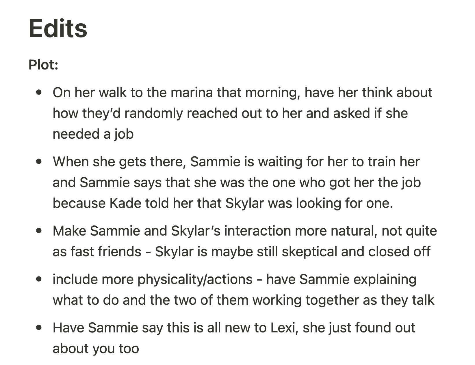 For instance, I wrote in the edits for chapter 9 to include a specific conversation that showcased my MMC’s arc more. This helped give future me more detailed instructions so I wouldn’t forget to include the big overall edits throughout the book.