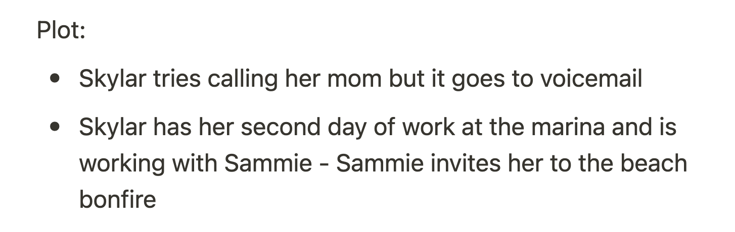 So I tried to keep it to just a few bullet points that summed up the main things in that chapter. It can be difficult to know what to include for this part, but one way to think of it is: how would you quickly describe the chapter to a friend? You can get ideas for your plot points from there.