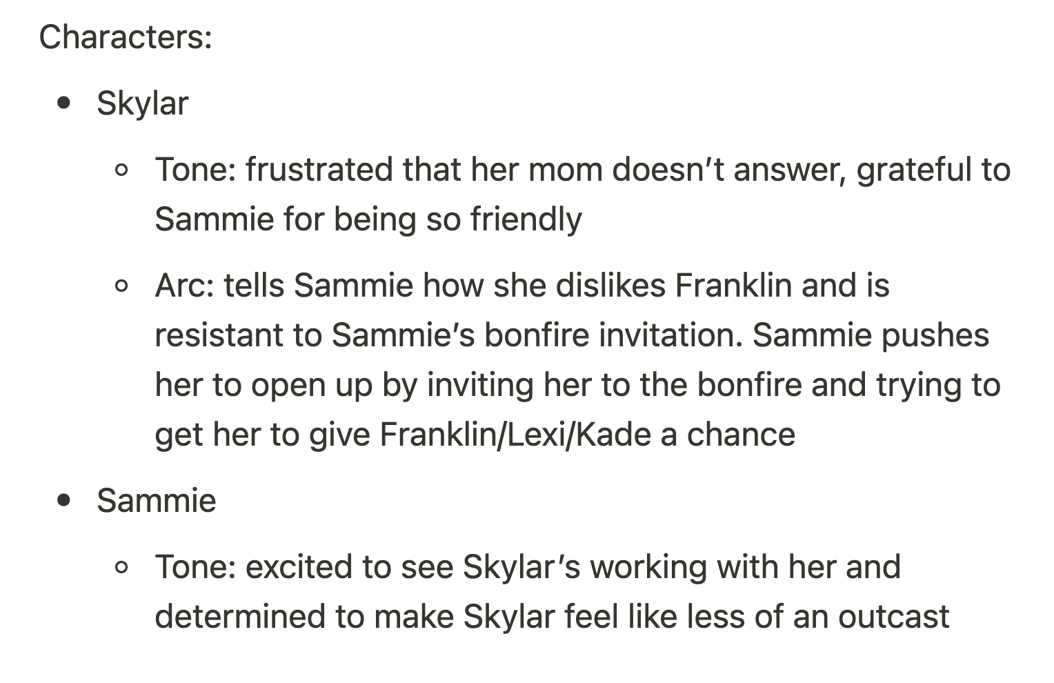Here is a screenshot of what the bullet points looked like for each of my characters in my chaptered outline: